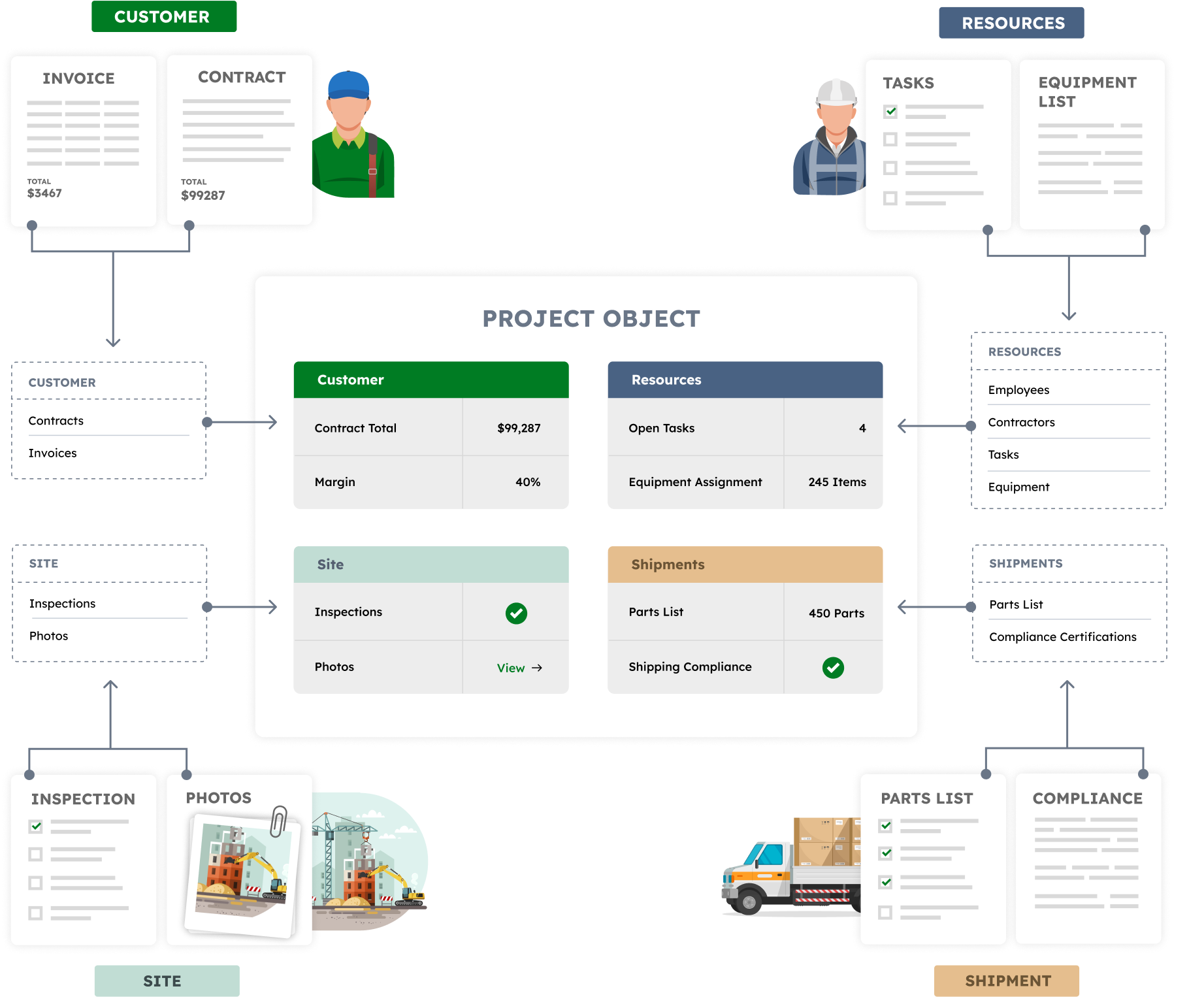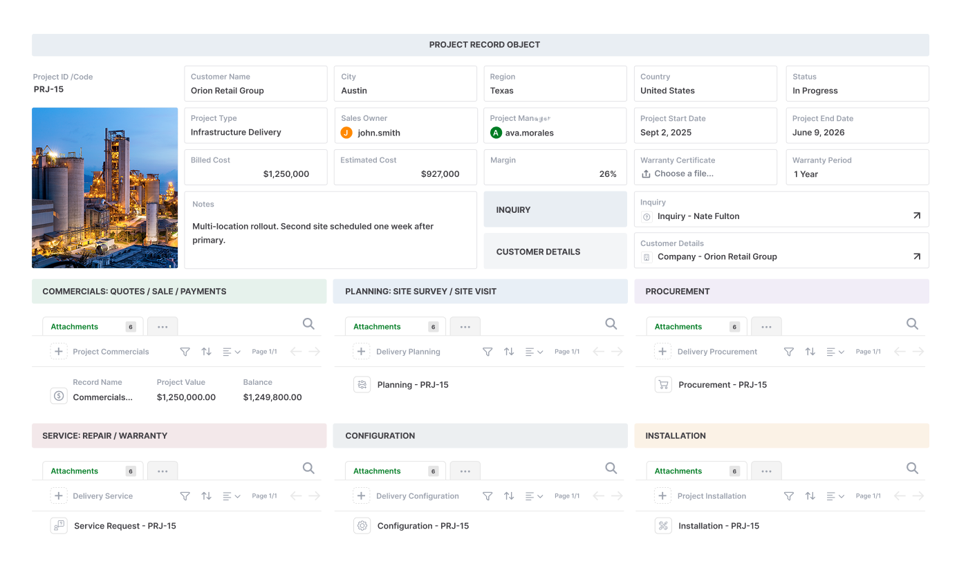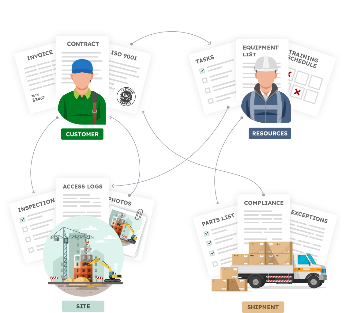 Most tools store data in tables. But real operations don’t work that way. A vendor has contacts, contracts, invoices, certifications. A project has tasks, files, photos, and approvals. A product has components, inspections, and revisions. These things belong together as a single unit, not scattered across multiple sheets or modules.