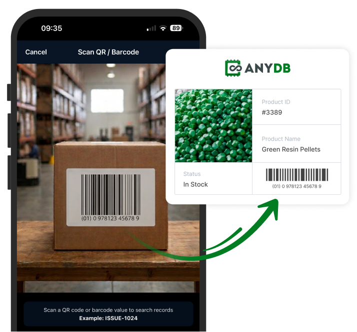 AnyDB Mobile allows teams to scan barcodes and QR codes directly from the app. Staff scans items on the spot to keep the system accurate in real time. Scanning a barcode or QR code instantly opens the exact matching digital record on the mobile device.