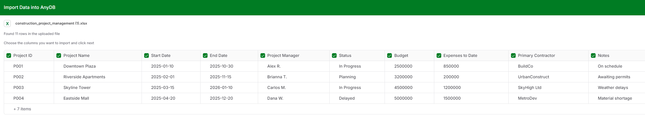 A preview of the data to be imported is shown allowing you to select the columns that you want to import.