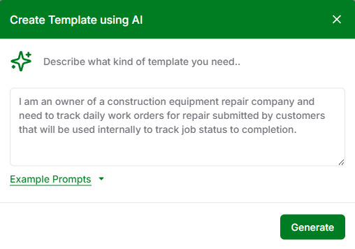 It is now possible to generate templates in seconds by using AI prompts. Simply describe the type of template you want and it will create a full fledged template. Once created you can edit the template and customize it to what you want. You can remove fields and add new fields.