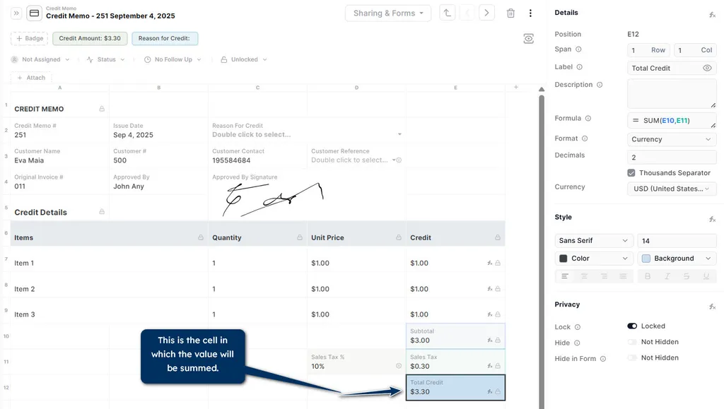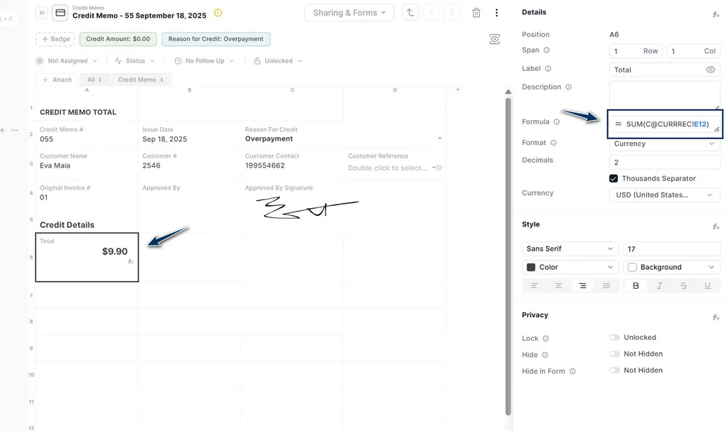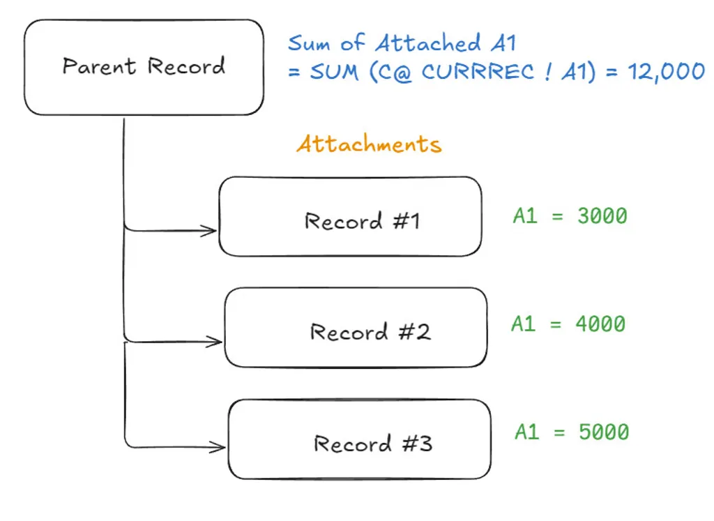 Step 2: Go to the main record, select the cell where the total amount will be shown, and add the formula: SUM (C@CURRREC!A1).