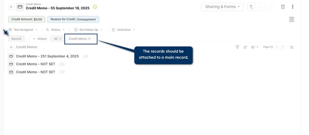 Step 1: Attach all credit memo records to a single main record, such as a dashboard or a home page.