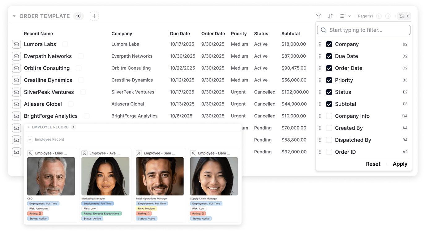 No more duplicate data or outdated spreadsheets. Views and search pull from live records, so changes update instantly for everyone.