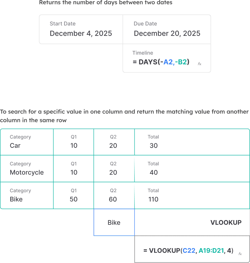 • 50+ Excel-style functions including SUM, WORKDAY, DATE, VLOOKUP, IF, COUNTIFS, and more