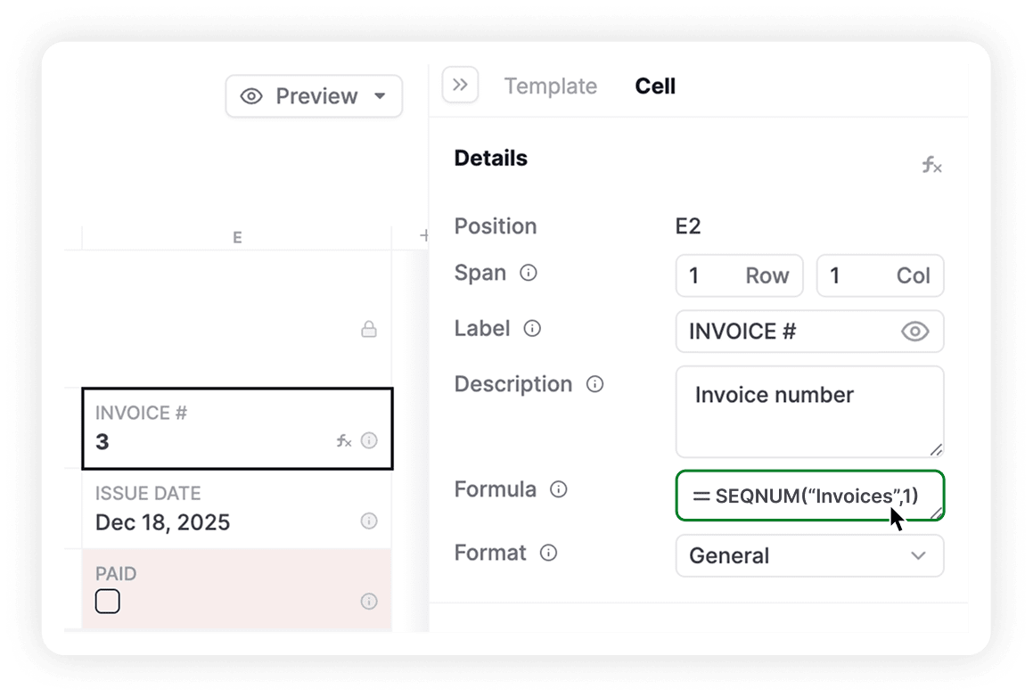 • Create invoice numbers: SEQNUM(“Invoices”, 1)